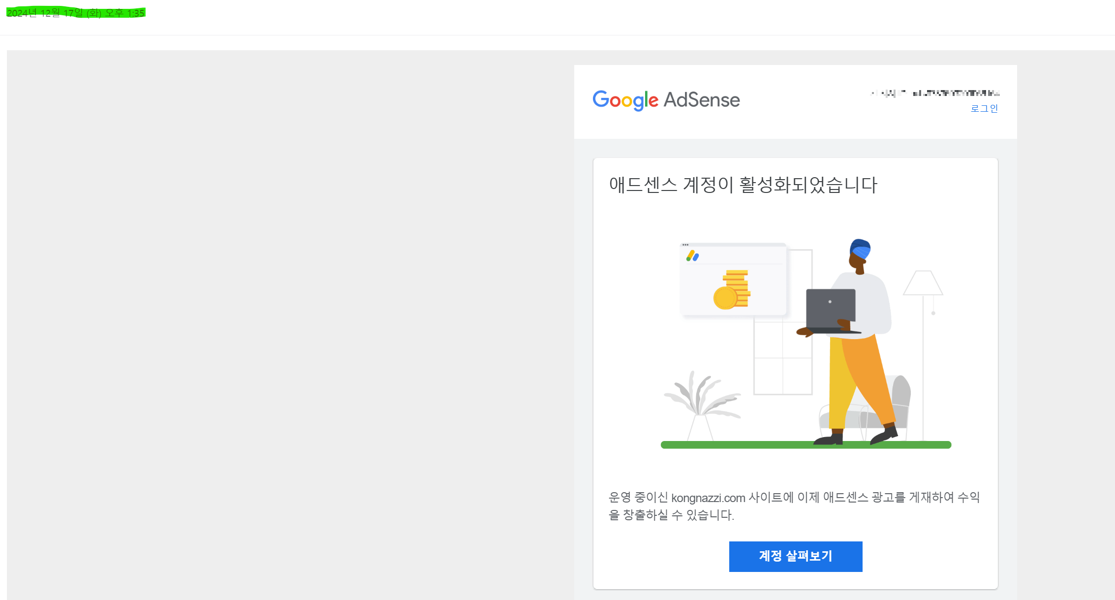 이건 애드센스 계정 가입 후 받은 메일입니다.