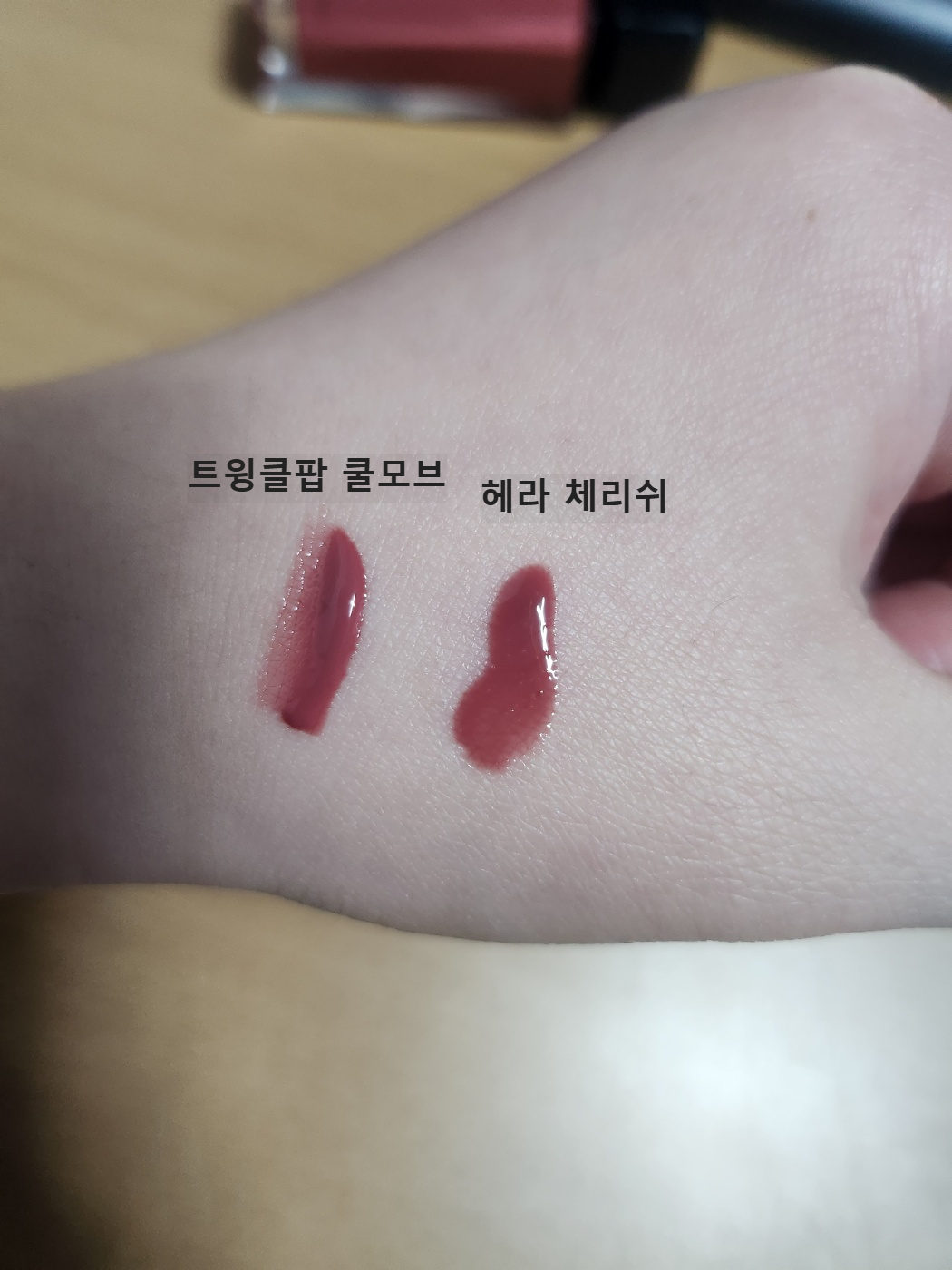 문질렀을 때 색상차이는 거의 없어요. 이사진은 헤라가 좀 더 쿨하게 나왔는데 실물은 쿨모브가 더 모브빛이 더 돌았어요.